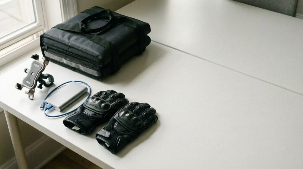 モバイルバッテリーも用意しておくと安心です。配達中はGPSとナビを常時使うので、バッテリーの消耗が早くなります。
