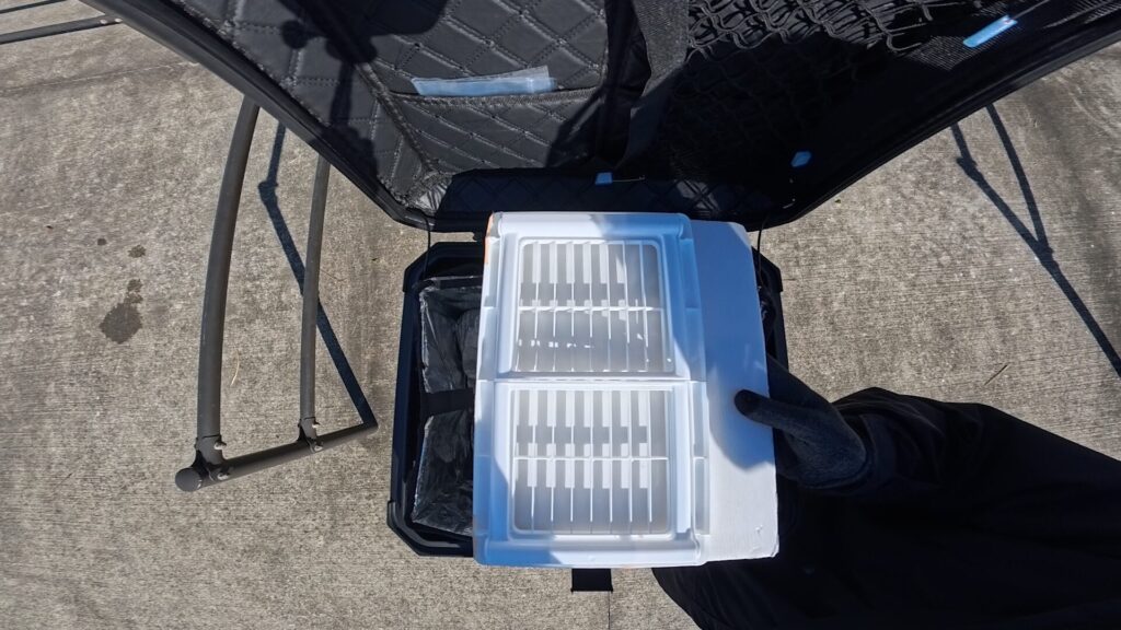 自分の場合はボックスの中に保冷バッグを入れて使う前提なので、55Lに落ち着いています。