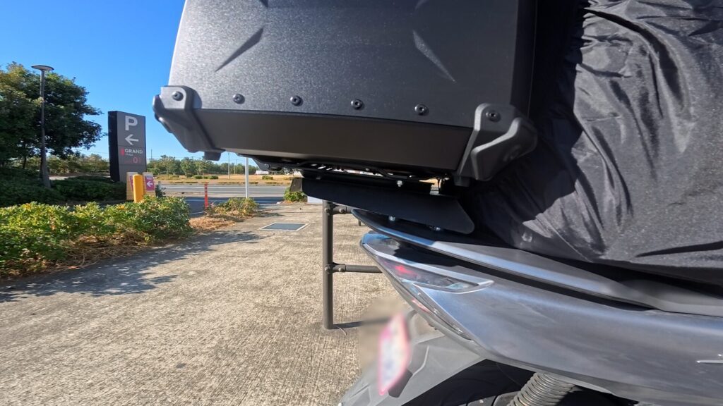 リアボックスのレール部分にストラップを取り付けて、公式バッグの片紐にある手持ちの取手に引っかけて固定。これでかなり安定します。